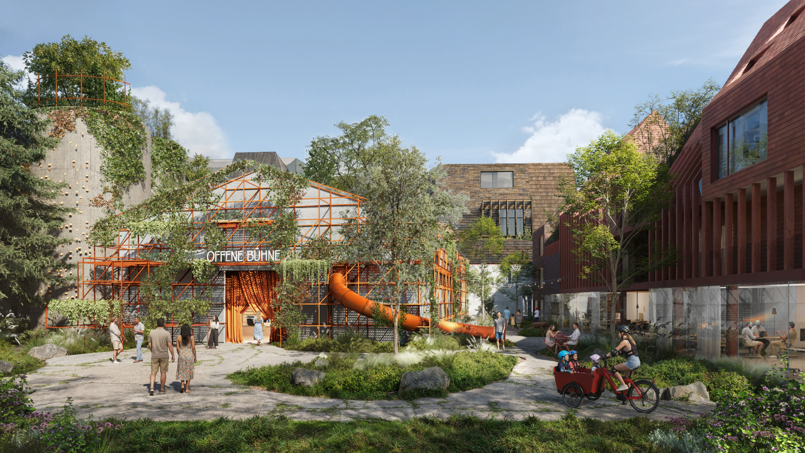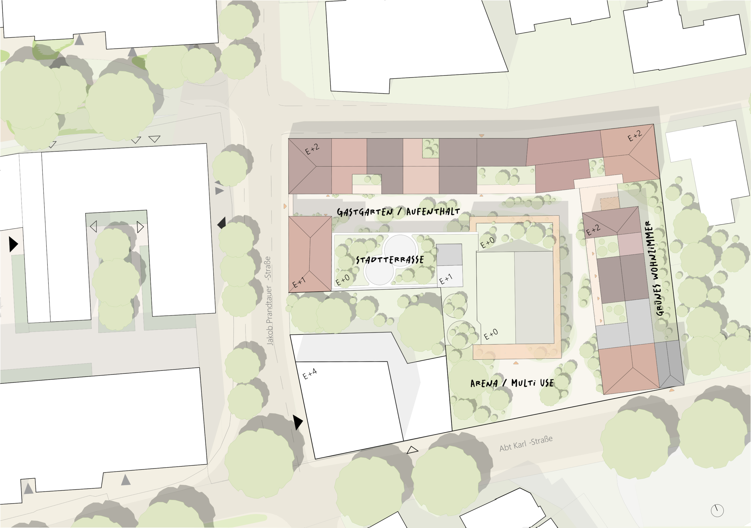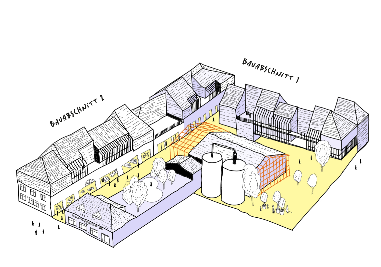 Das verbindende Zentrum ist die neue Eingangssituation an der Abt-Karl-Straße. Hier wird das Gerüst zum neuen Highlight: Ursprünglich als temporäres Hilfsmittel in den Bauphasen gedacht, bleibt es als dauerhaftes, wandelbares Element bestehen. Es wird zur bespielbaren Intervention – ein Ort, an dem Pflanzen emporranken, Menschen verweilen, Banner Botschaften tragen und Tiere neue Nischen finden. Das Gerüst ist damit mehr als reine Struktur: Es wird zur offenen Bühne, die Wandel sichtbar macht und gleichzeitig neue Formen von Nutzung, Gemeinschaft und Natur ins Quartier bringt. Nicht nur das Gerüst ist wandelbar: auch die Halle, das neue Herzstück, ist multifunktional. Während Abends Veranstaltungen stattfinden, werden tagsüber Workshops abgehalten. Ein bunter Mix – wie die Umgebung.