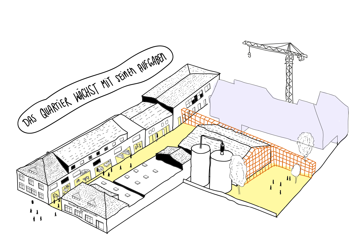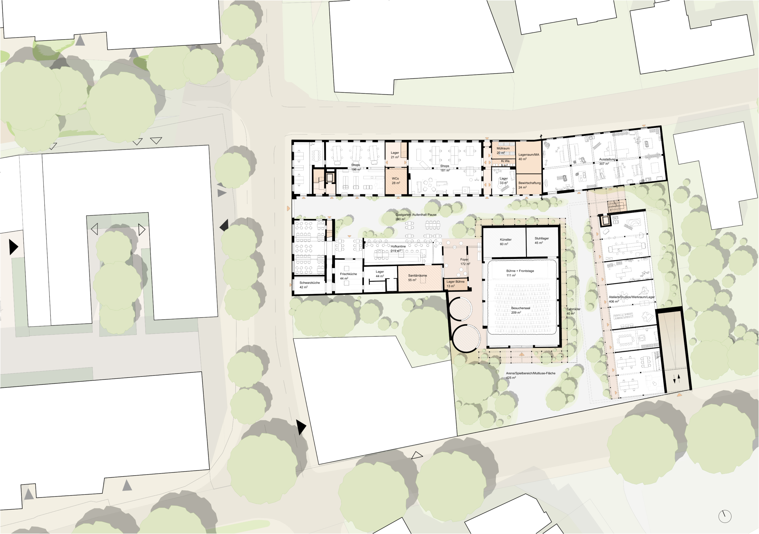 Die Weiterentwicklung des Areals geschieht Schritt für Schritt – organisch, punktgenau, ohne Brüche. Der Bestand darf bleiben, der Rest wird behutsam, rückbaubar und in Holzbauweise aufgefüllt. Die schrittweise Weiterentwicklung des Areals wird nicht unterbrochen, sondern bewusst weitergeführt. Im spielfreien Sommer kann die bestehende Halle als neuer Saal ertüchtigt werden und im Bestand die Erdgeschosszone adaptiert werden. Anschließend funktioniert das bestehende Gebäude wieder für sich und im hinteren Bereich kann mit der Nachverdichtung begonnen werden. Je nach Bedarf können die Bestandsgebäude im Leichtbau aufgestockt werden und auf die Anforderungen flexibel reagiert werden. Denn nur ein wandelbares Gebäude ist ein langlebiges Gebäude. Die Aufstockung des Bestandes folgt der Farbgebung der Umgebung. Sie bedient sich aus dem üppigen Katalog der Nachbarschaft. So werden die Typologien der angrenzenden und weiteren Umgebung auf dem Gelände der Tischlerei weitergeführt. Auch die Materialien der Umgebung, die dort ihre Lebensdauer vollendet haben, bekommen in Form der Neubauten und Aufstockung ein neues Zuhause. Vertraute Gesichter in neuer Umgebung. Vergangenheit und Zukunft reichen sich hier, ähnlich wie die Menschen vor Ort, die Hand. Man lernt voneinander, erzählt alte Geschichten weiter und schreibt neue.