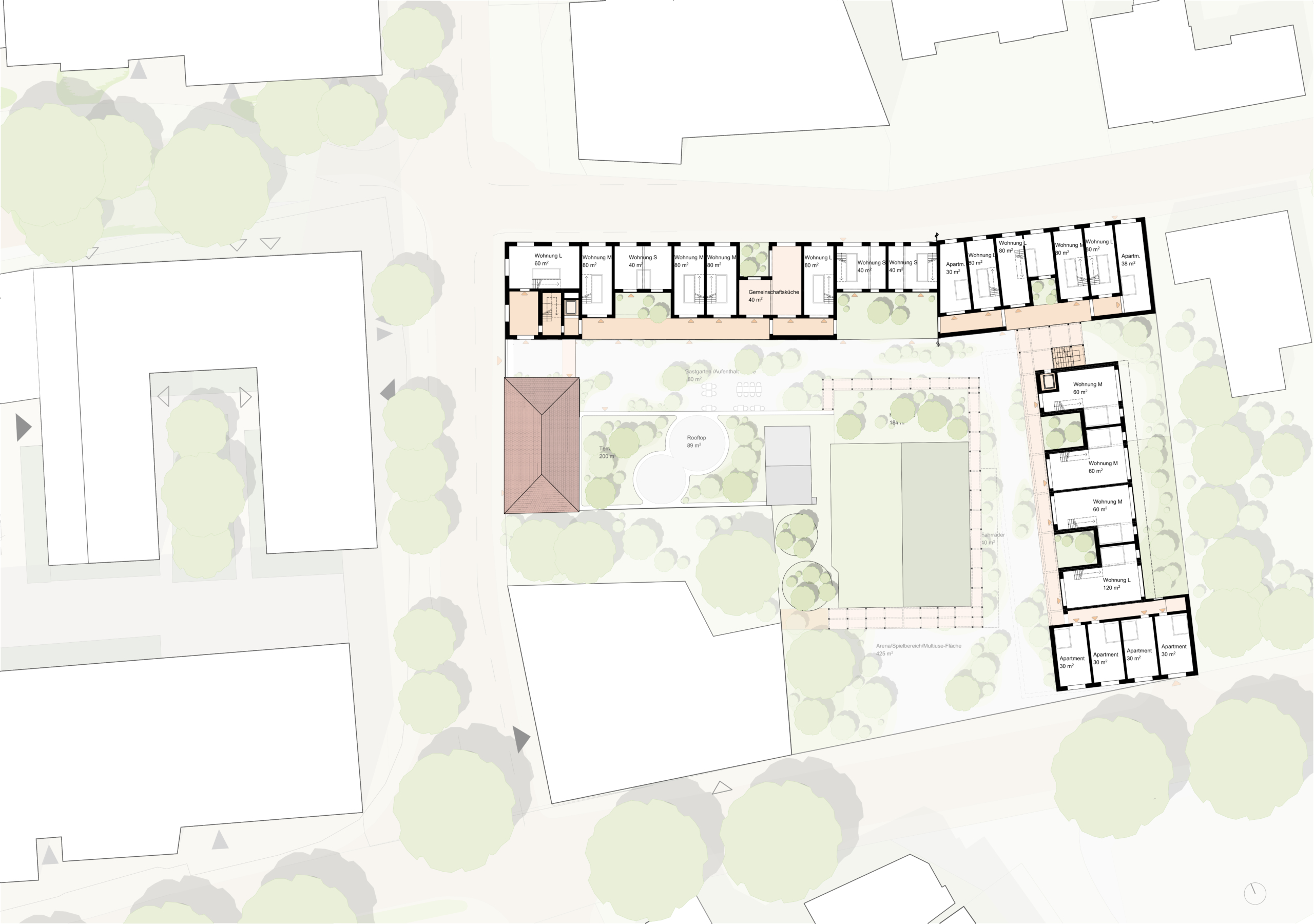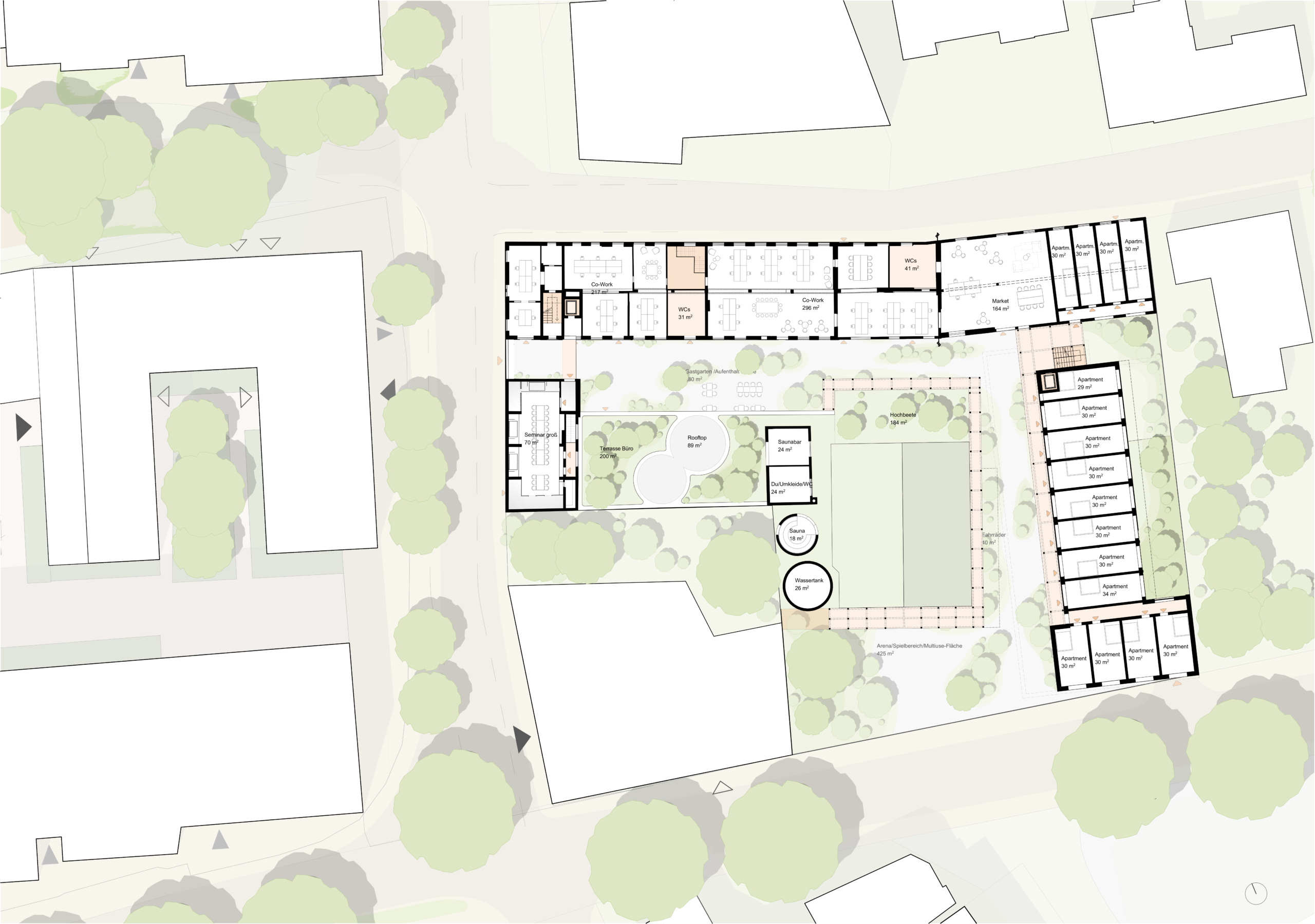 Derzeit wirkt das Areal unübersichtlich; selbst die Eingänge sind schwer zu finden. Eine neue intuitive Durchwegung und eine offene Erdgeschoßzone machen das Innere sichtbar und spürbar. Die Bühne zieht in die bestehende Lagerhalle um – damit wird die „neue Gasse“ frei. Sie wird zum belebten Herzstück des Quartiers: Kleinteilige Fassaden, vielfältige Nutzungen und ein menschlicher Maßstab geben dem Gelände Offenheit und Zugänglichkeit. Wie in der Altstadt wird hier wieder flaniert, eingekauft, gespielt, gearbeitet. Auch im Obergeschoss setzt sich die Idee fort: ein Laubengang-Netzwerk schafft Wege, Begegnung und Austausch. Nachbarschaft wird so überall (er)lebbar. Der Gassenverkauf, der Werkstatteinblick, das Gespräch im Vorbeigehen: plötzlich wird das Quartier selbst zur Bühne des Alltags.